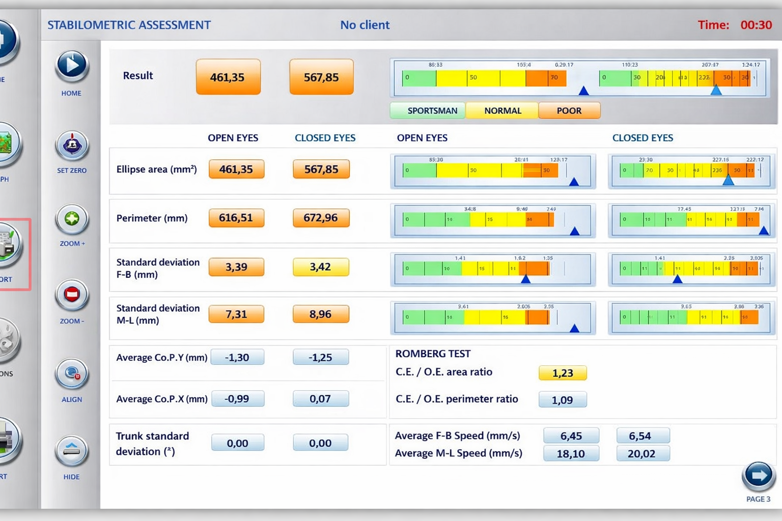 Ad esempio, confrontando i vari parametri (ampiezza, velocità, accelerazione, posizione media) e le oscillazioni ad occhi aperti e ad occhi chiusi (Indice di Romberg) potrà essere evidenziata l'eventuale difficoltà nel compensare il deficit di informazione visiva con gli altri due sistemi sensoriali coinvolti: la propriocezione muscolo-articolare e il sistema vestibolo-cerebellare.