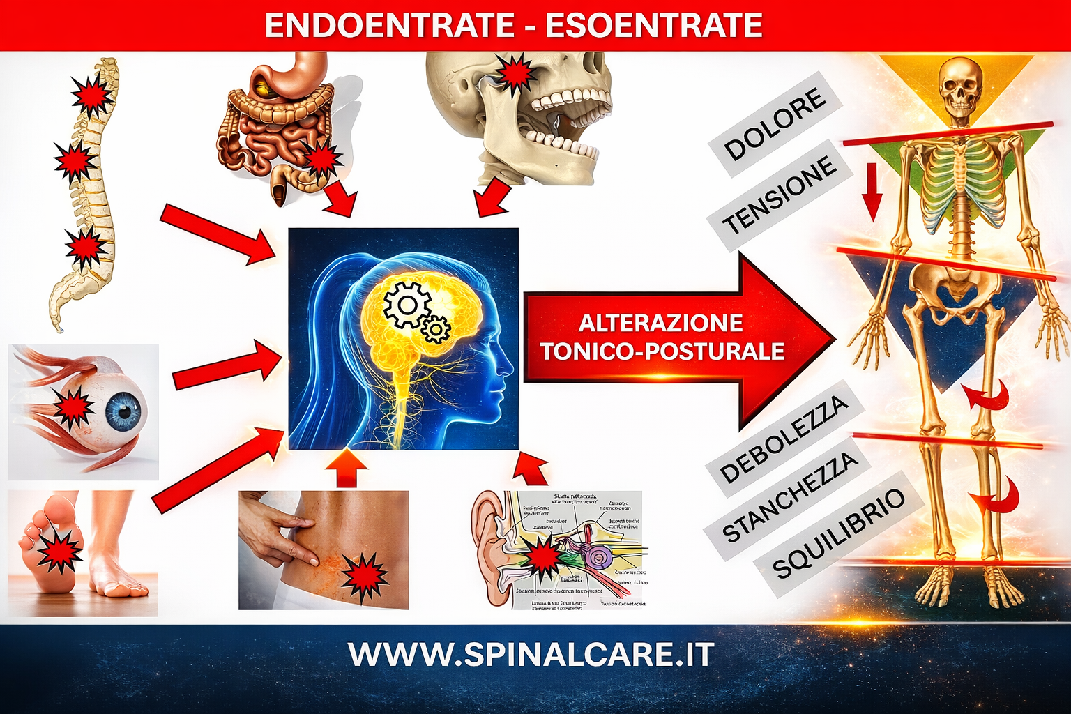 Infatti, è sufficiente che anche sola una delle eso/endoentrate sia compromessa, che il corpo reagirà con una continua e anomala variazione del tono muscolare provocando dolori, stress e fatica.